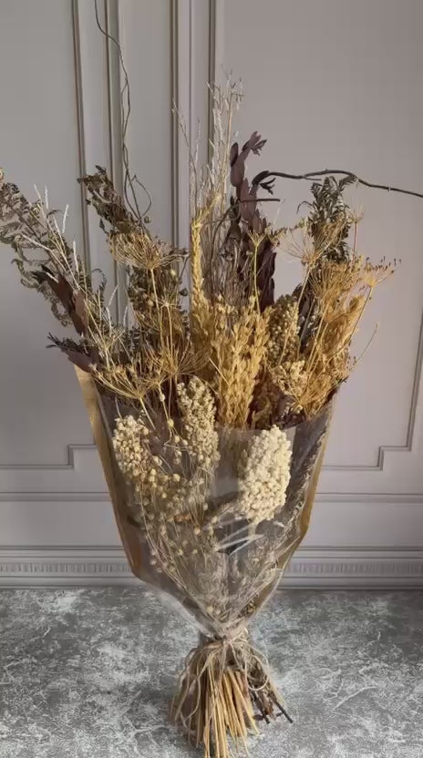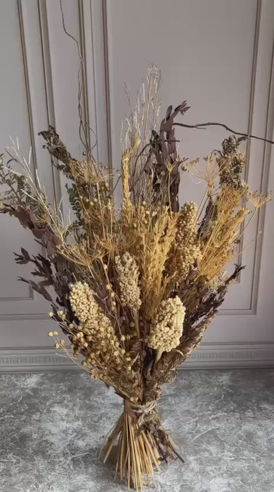 Golden wheat and pale millet rise against deep toasted foliage and fine, lacy grasses. A sculptural gathering of fully dried botanicals, in Afterhours the palette moves from soft ivory to burnished browns and muted ochres, creating an arrangement that feels both raw and luxurious.